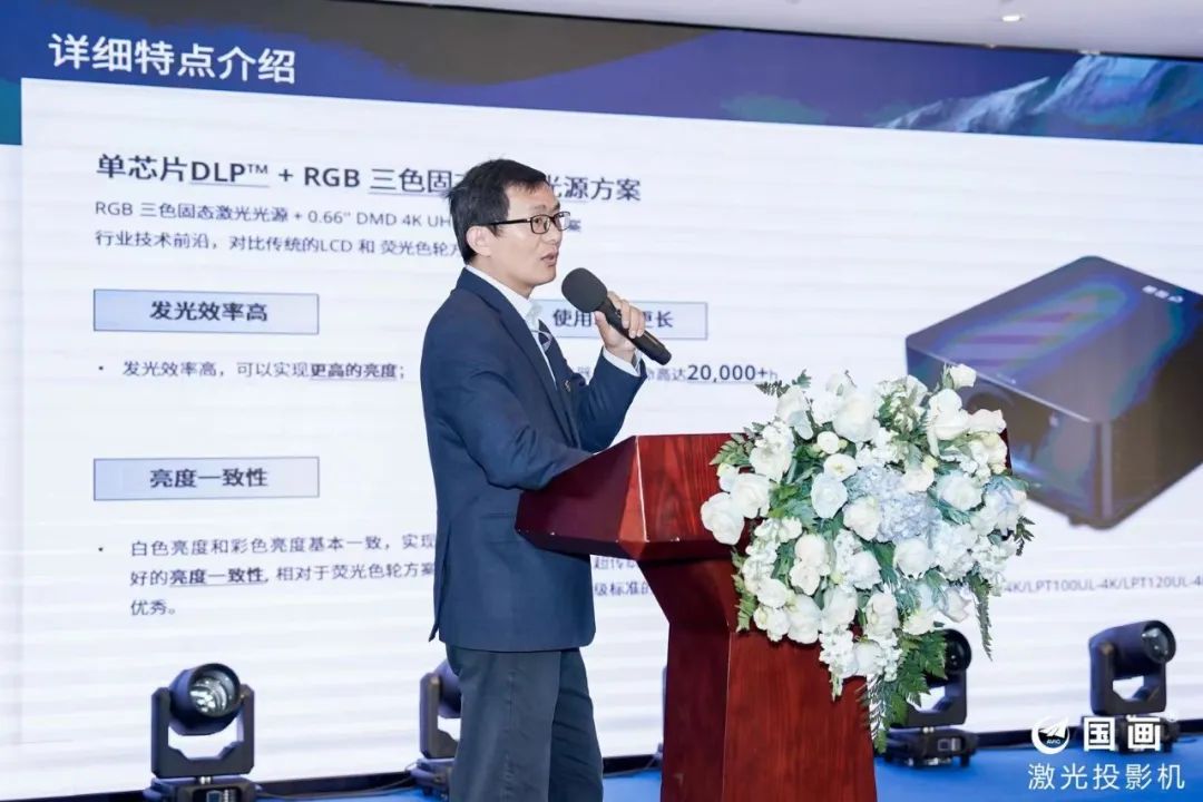隨后,國畫4K三色激光高亮度工程投影機(jī)新品在眾人矚目下正式亮相。中航國畫公司研發(fā)副總經(jīng)理郭健向現(xiàn)場嘉賓詳細(xì)闡述了該產(chǎn)品的技術(shù)特點(diǎn)和優(yōu)勢。他提到,本款采用了“單芯片DLP + RGB 三色固態(tài)激光光源方案”,可實(shí)現(xiàn)更高亮度和對比度,色域?qū)拸V,覆蓋130%NTSC色域和完整的DCI-P3色域,輸出可視分辨率為3840*2160,畫面均勻度超過90%,通過用三色激光方案替代色輪方案,更好地解決了色輪方案在白色和彩色畫面之間亮度不一致的問題;新品首次采用了IP6X防塵標(biāo)準(zhǔn)設(shè)計(jì)、多驅(qū)動激光光學(xué)引擎、高熱量低熱阻散熱優(yōu)化等技術(shù),全面提升了整機(jī)可靠性,同時(shí)采用定制化嵌入式系統(tǒng),有效規(guī)避開源系統(tǒng)或通用系統(tǒng)帶來的信息泄露威脅。在可維修性方面,新增了上位機(jī)遠(yuǎn)程控制軟件、固件網(wǎng)絡(luò)升級軟件等軟件功能,還開放了各種API接口,便于用戶后續(xù)軟件升級、維護(hù)檢測。郭健還表示,新品特別采用了低功耗和降噪設(shè)計(jì),是博物館、會議室等安靜空間的理想選擇,能為用戶提供更節(jié)能安靜的顯示方案。