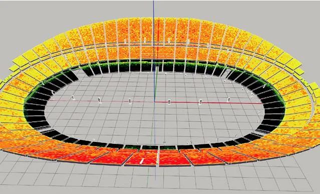 西側(cè)觀眾席分布了8組12英寸三分頻線性陣列揚(yáng)聲器,每組最多15只,最少9只。南側(cè)觀眾席揚(yáng)聲器共分布3組,北側(cè)觀眾席揚(yáng)聲器組共分布2組,每組9只12英寸三分頻線性陣列揚(yáng)聲器。
