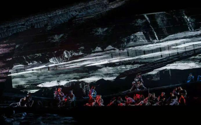 影像可以為舞臺演出營造豐富的視覺效果,同時更值得關注的是,它的存在使布景自身具有了四維屬性,從靜態(tài)圖片轉向動態(tài)畫面,盡管沒有演員的配合,影像自身也能具備傳遞戲劇情節(jié),釋放情感信號的表現功能。在時間維度上,影像通過連續(xù)的幀數變動使戲劇的時空維度得到拓展,布景自身擁有推進戲劇情節(jié)發(fā)展的作用。