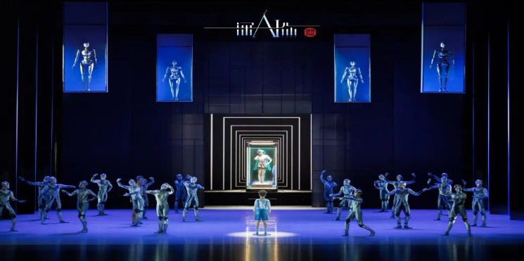 23年深圳戲院執(zhí)行制作的《深AI你》,作為國內首部人工智能題材當代舞劇,需要通過媒體影像呈現出當下不存在的虛擬未來,營造出適配科技感的場域。劇中設計兩面數控機械裝置控制的冰屏,在根據情節(jié)需要將影像內容進行轉變。改變冰屏的傾斜角度去配合演員的調度和劇情的變化。影像內容充分運用機器人、裸眼3D、高科技屏幕等科技元素,展現出科技世界的智能性。多塊冰屏影像塑造出科技智能的多變、立體化層次空間,推動著演出·畫面對觀眾視線的引導,使觀者深入聚焦在人工智能,感受未來科技美學與藝術的完美結合。
