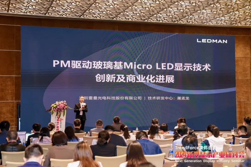 雷曼光電受邀出席并由技術(shù)研發(fā)中心高級總監(jiān)屠孟龍先生發(fā)表題為《PM驅(qū)動玻璃基Micro LED顯示技術(shù)創(chuàng)新及商業(yè)化進(jìn)展》的主題演講,與行業(yè)大咖共同為加速M(fèi)icro LED產(chǎn)業(yè)商業(yè)化出謀劃策。他從創(chuàng)新技術(shù)路線、攻克難點(diǎn)以及未來應(yīng)用價值等維度深入剖析Micro LED產(chǎn)業(yè)鏈的高質(zhì)量發(fā)展路徑,并向與會嘉賓介紹雷曼光電最新發(fā)布的PM驅(qū)動玻璃基Micro LED 顯示技術(shù)及商業(yè)化進(jìn)展。