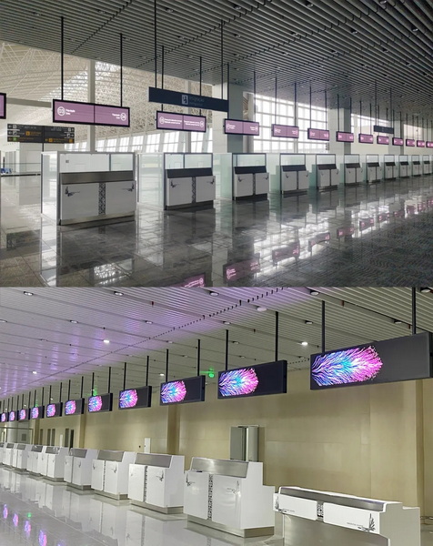位于國際、國內(nèi)抵達位置的顯示屏以及26塊位于海關進出港上方均采用點間距2.5的光旭系列,它具備的高強度、輕重量等卓越特性,確保了在各種環(huán)境下都能穩(wěn)定、高效地運行,屏幕分辨率為5400×600,呈現(xiàn)出精準的色彩和畫面效果。