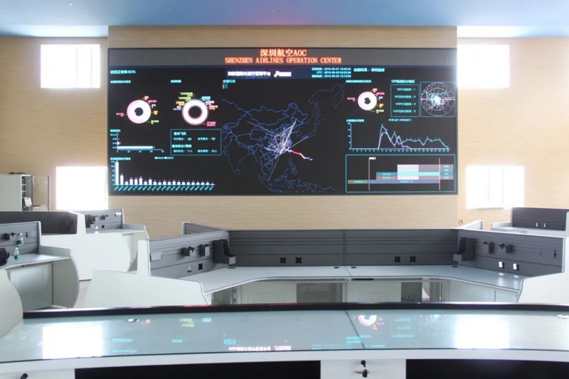 機場運控大廳同樣采用點間距2.5的光旭系列顯示大屏,大屏面積為34.375㎡,為機場的信息化運維調(diào)控提供了強有力的支持。