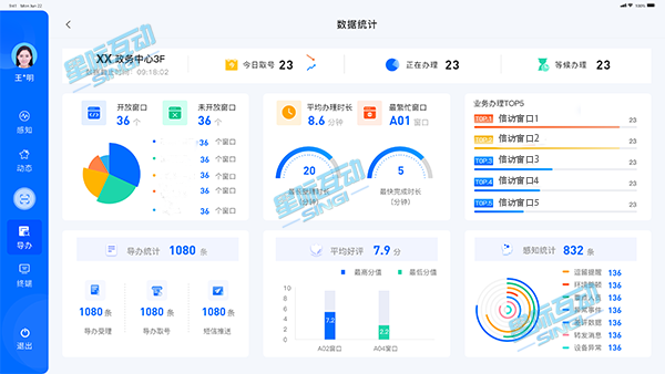 多維度展現(xiàn)大廳虛擬化場景,按照實(shí)景比例縮放,在大屏幕上展示,主要顯示大廳各區(qū)域工作狀態(tài)、各設(shè)備運(yùn)行狀態(tài)、各崗位辦公人員信息、各崗位在崗情況等;