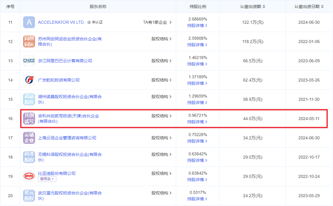 近日,愛企查官網(wǎng)顯示,上海顯耀顯示科技有限公司(以下簡稱“JBD”)發(fā)生工商變更,公司注冊資本增加至5584.17萬元,新增股東吉利共創(chuàng)貳號投資合伙企業(yè),持股JBD比例為0.97%,認(rèn)繳出資44萬元。根據(jù)控股結(jié)構(gòu)信息顯示,吉利共創(chuàng)貳號投資合伙企業(yè)由吉利控股集團(tuán)間接控股。