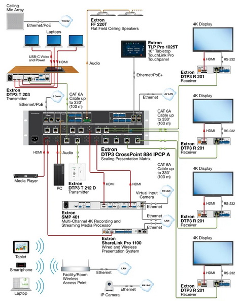 DTP3全系列基礎(chǔ)視頻傳輸帶寬為18Gbps,完全支持4K/60 4:4:4。每個視頻輸出都配備Extron Vector 4K技術(shù),無縫切換,徽標嵌入功能,網(wǎng)傳接口可以輸入輸出擴展到100米遠的距離。內(nèi)置音頻矩陣采用了Extron的ProDSP技術(shù),內(nèi)置AEC功能和32*32的Dante網(wǎng)絡(luò)傳輸功能,可以級聯(lián)擴展。內(nèi)置的200W功放,定壓定阻模式可以根據(jù)需求進行調(diào)節(jié)。