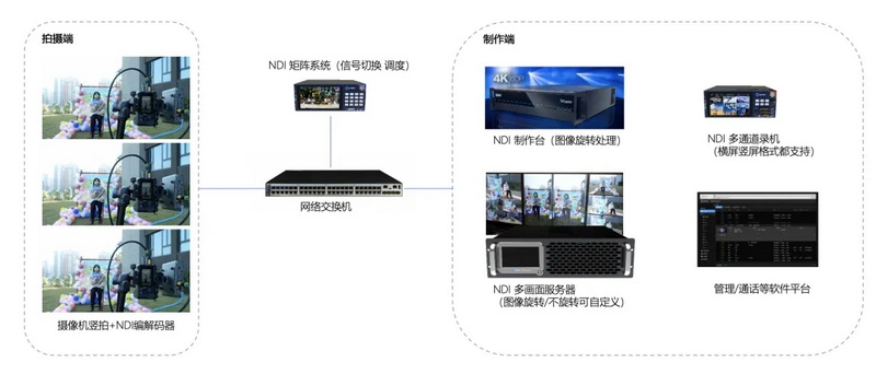 前端多機(jī)位攝像機(jī)豎屏拍攝,比如通過L支架固定方式,然后通過NDI編解碼器轉(zhuǎn)化為NDI IP流信號(hào)進(jìn)入后端的NDI切換臺(tái)及NDI字幕包裝系統(tǒng)。NDI切換臺(tái)可以將視頻信號(hào)進(jìn)行旋轉(zhuǎn)、豎屏切換、包裝等,隨后輸出豎屏PGM信號(hào)。系統(tǒng)中的NDI矩陣、NDI多通道錄機(jī)等,均可對(duì)豎屏信號(hào)(或橫屏)進(jìn)行切換分發(fā)及錄制;NDI多畫面系統(tǒng),也可以對(duì)多機(jī)位信號(hào)源進(jìn)行旋轉(zhuǎn)后呈豎屏顯示,或直接顯示豎屏PGM信號(hào),供導(dǎo)播監(jiān)看。該方案可以很好對(duì)豎屏場(chǎng)景進(jìn)行完整構(gòu)圖,不足是無法滿足橫屏制作,若同樣的節(jié)目場(chǎng)景還需輸出橫屏內(nèi)容,則需增加橫屏拍攝機(jī)位。