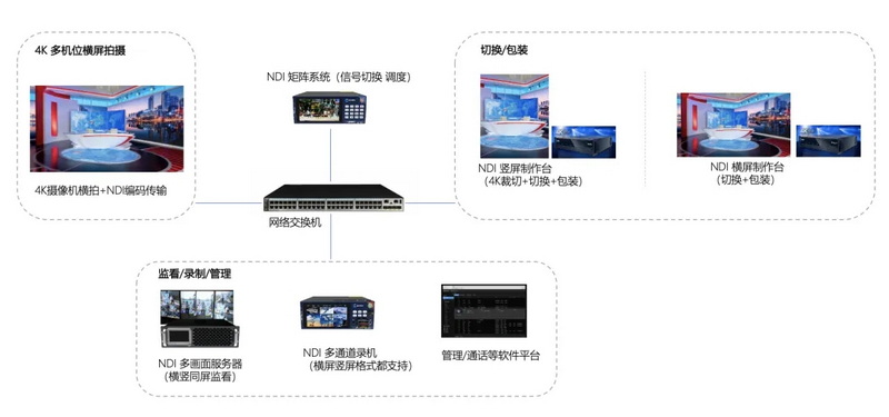 前端多機(jī)位攝像機(jī)正常橫屏拍攝,轉(zhuǎn)換為NDI IP信號(hào)進(jìn)入后端NDI切換臺(tái)。用于豎屏制作的NDI切換臺(tái),可對(duì)橫屏信號(hào)進(jìn)行裁切后生成多路豎屏素材,經(jīng)過切換包裝后輸出豎屏PGM信號(hào)。而用于橫屏制作的NDI切換臺(tái),則可直接利用橫屏信號(hào)源進(jìn)行制作包裝,輸出橫屏PGM信號(hào)。系統(tǒng)中NDI矩陣、NDI多畫面系統(tǒng)、NDI多通道錄機(jī)等,都支持豎屏/橫屏信號(hào)的處理。該方案要求前端拍攝采用4K拍攝,這樣通過后端裁切后才可保證是1080P高清PGM信號(hào)。顯然這個(gè)裁切方案的優(yōu)勢(shì)是可支持橫豎同屏制作,滿足演播室大屏/小屏一起播出的業(yè)務(wù)需求,但是對(duì)現(xiàn)場(chǎng)負(fù)責(zé)拍攝和豎屏裁切構(gòu)圖的老師提出更高的要求。