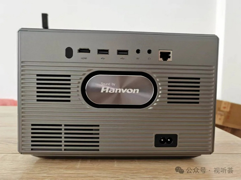 首先,從外觀上來看。這一款智能微投采用的是經(jīng)典的銀色外觀,十分具有質(zhì)感。在鏡頭所在正面,采用的是蒙布工。值得一提的是,這一顆鏡頭采用的是漢王自研的“獵鷹”全封閉光機(jī)鏡頭,可以實(shí)現(xiàn)精準(zhǔn)控光,讓光源更加集中,減少損耗。(我們?cè)诤竺娴漠嬅鏋榇蠹艺宫F(xiàn)),此外,在鏡頭配備了兩顆用于TOF自動(dòng)對(duì)焦攝像頭。