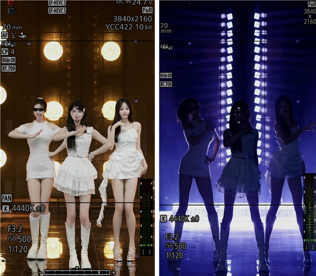 針對時拍傳媒的唱跳團播場景,佳能“佳直播”為其量身定制了三機位娛樂團播解決方案,采用2臺佳能EOS C80搭配RF70-200mm F2.8 L IS USM Z鏡頭,分別承擔主機位和特寫機位,另用1臺佳能EOS R5 Mark II搭配RF24-70mm F2.8 L鏡頭作為游機位。主機位負責(zé)拍攝整體舞臺的質(zhì)感和氛圍,特寫機位負責(zé)捕捉主播細膩的表情瞬間與動作細節(jié),游機位則通過多樣化的“花式”運鏡,帶來具有沖擊力的動感臨場視角,有效提升用戶停留時長。